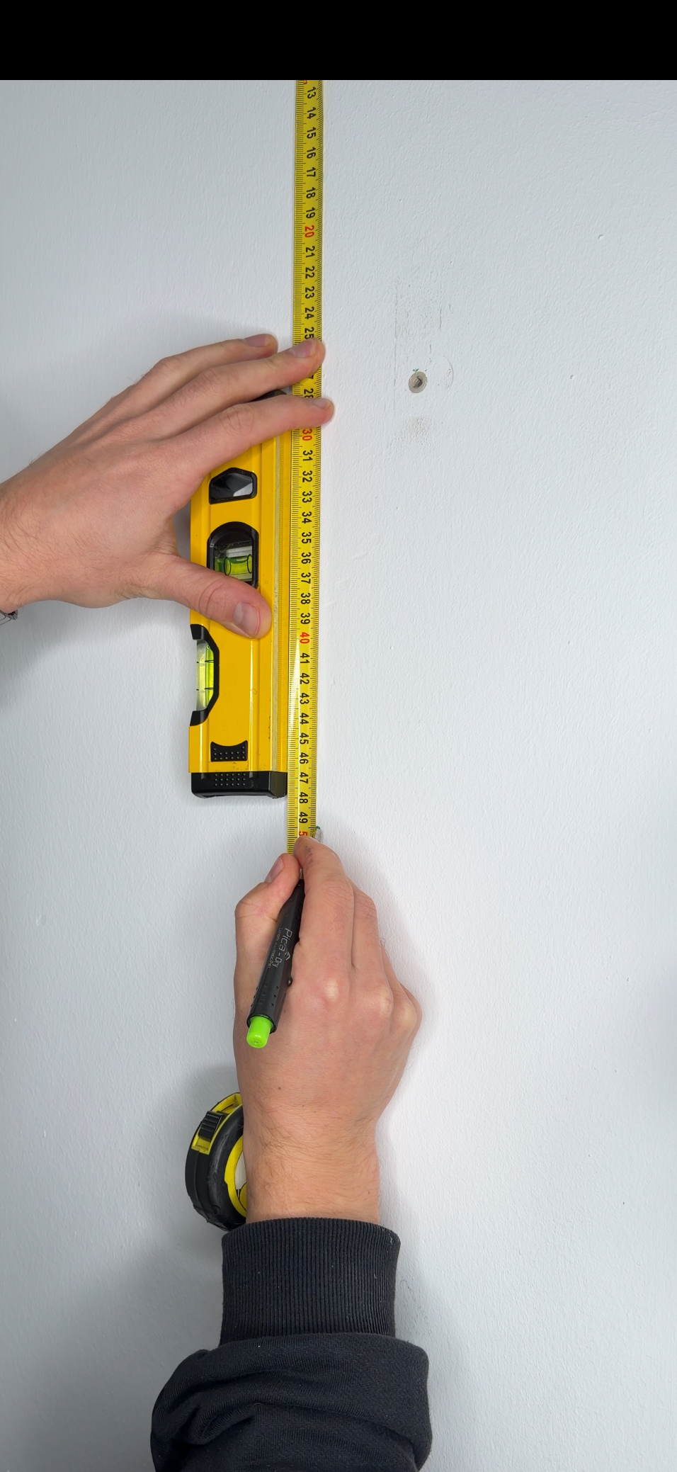 1. Zeichne zwei Bohrlöcher im Abstand von 495 mm an der Wand an. Nutze die Wasserwaage, damit der Organizer später gerade hängt.